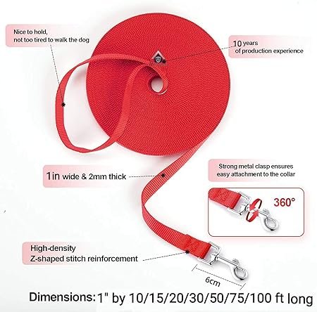 • DIMENSIONS – This dog leash measures 1inch wide by 30 feet long. Great for hiking, camping, training, hunting, backyard, beach, recall training, outdoor play with tennis balls, and swimming!